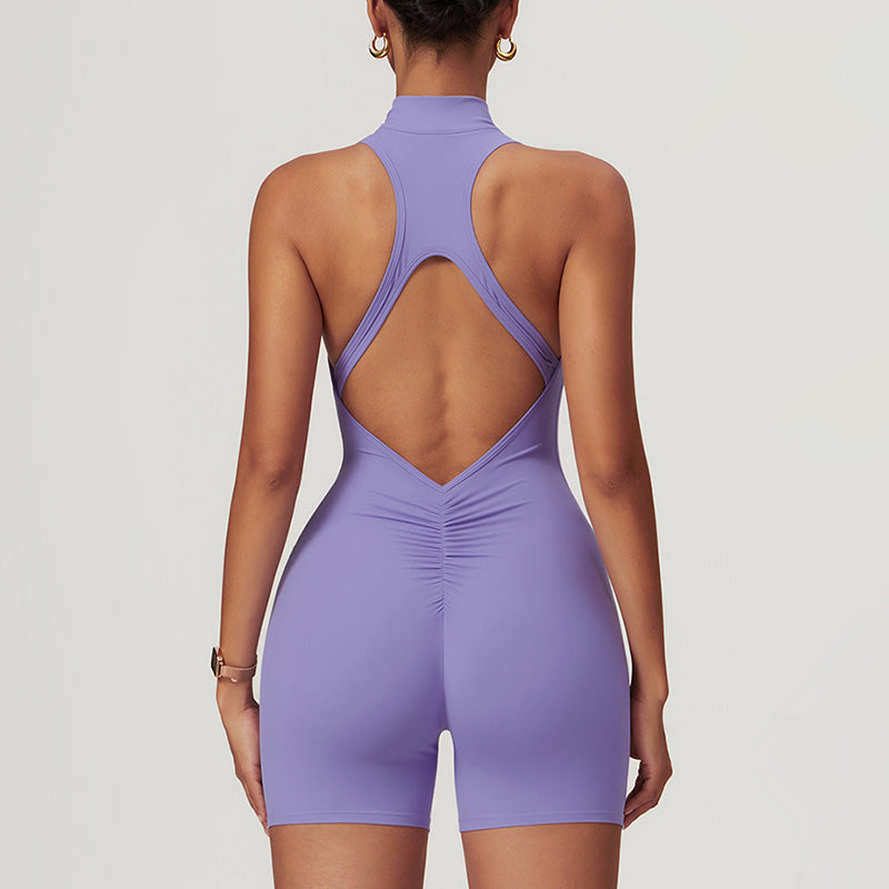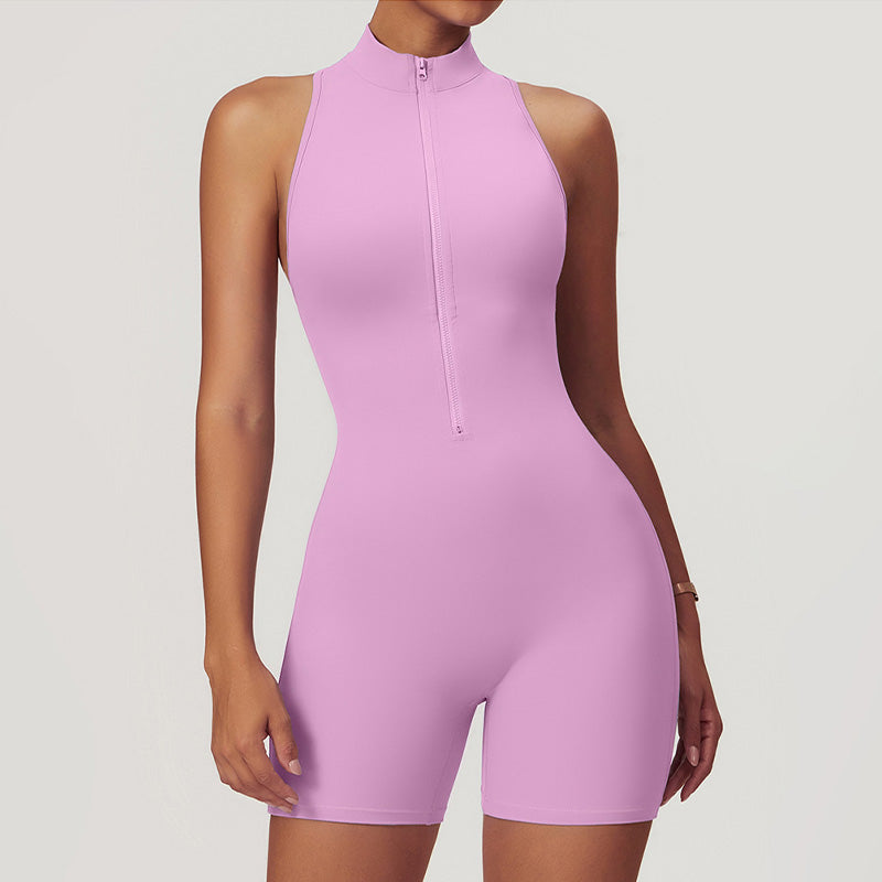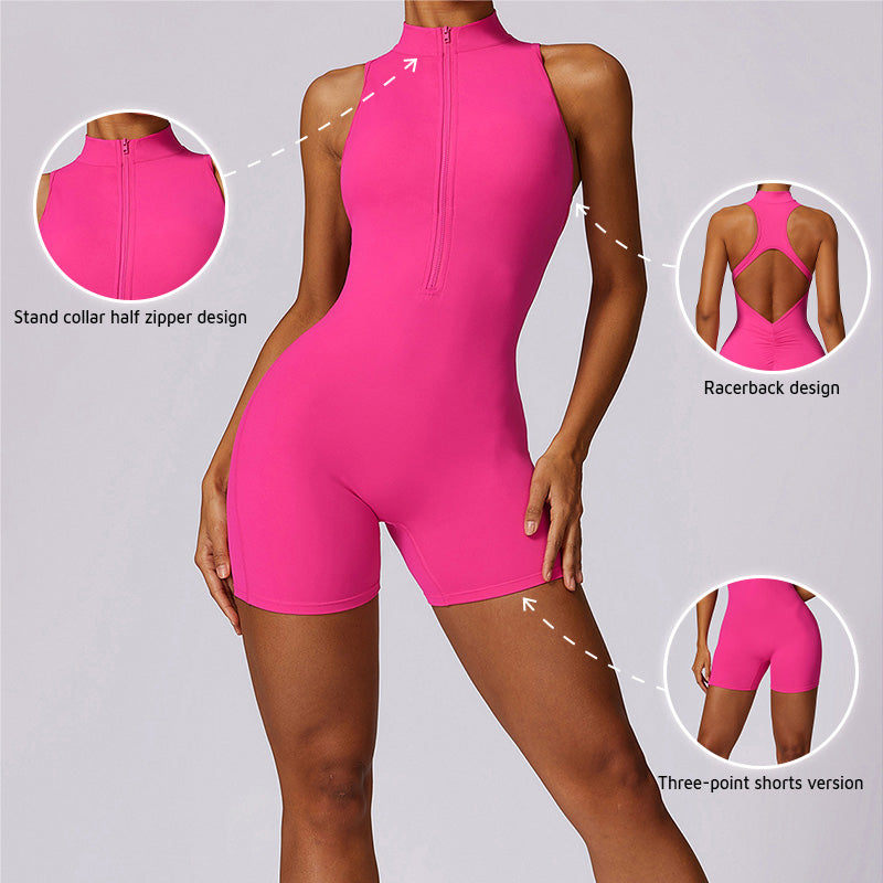 • Ultra-soft high resilience snug fit stand collar half zipper yoga short jumpsuits