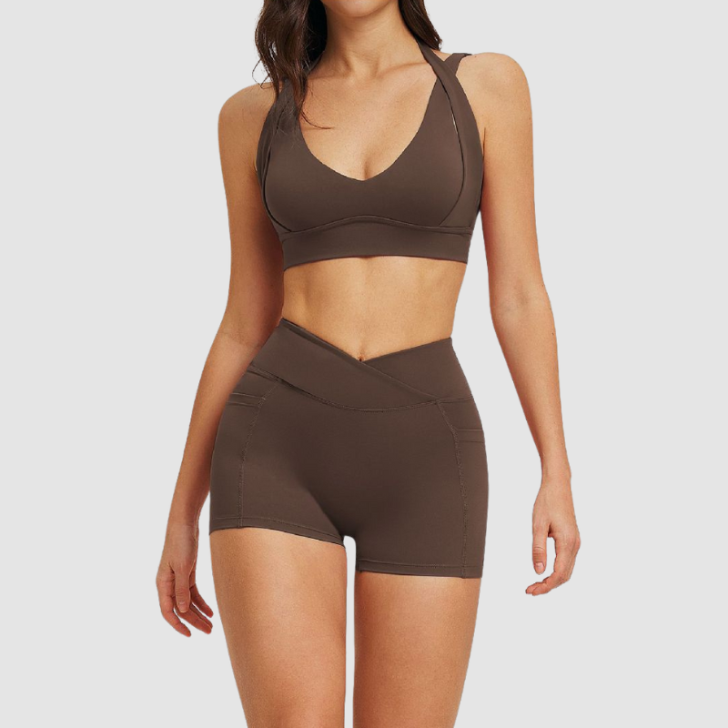 • Women's solid color halter neck sports bra with removable pads + high-waisted shorts