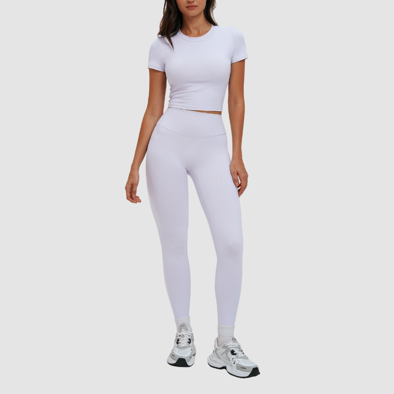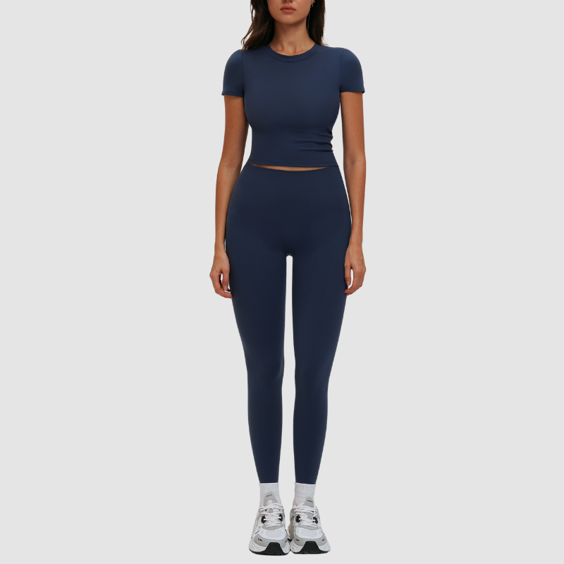 • Women's activewear set includes a round neck solid color slimming short-sleeved top and high-waisted leggings Unique Design Points: • Straight from our production line to you. Enjoy factory-direct quality yoga wear. • Small round neck design + slimming sports short sleeves • Butt-lifting and tummy-tucking slimming leggings