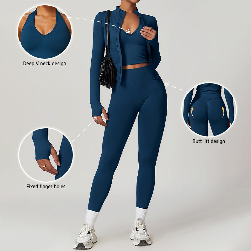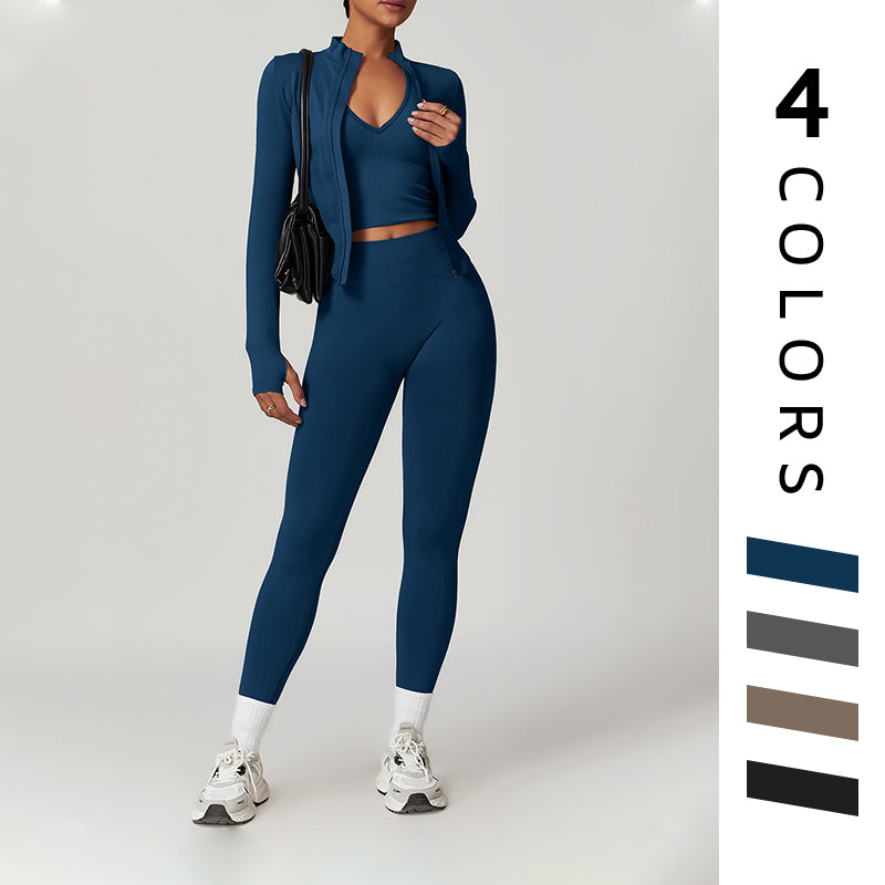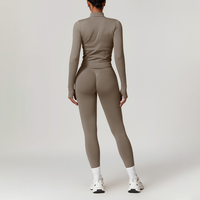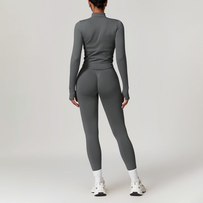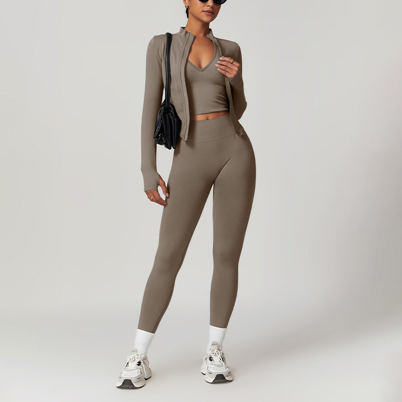 [-] Sujetador de yoga sin costura + piernas + chaqueta de cremallera completa de manga larga