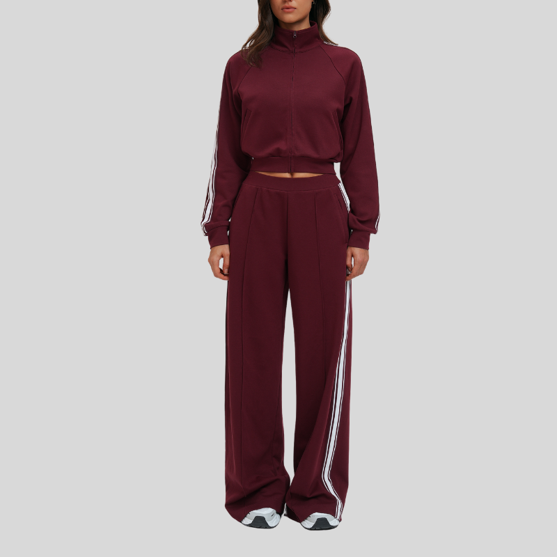 • Women's color-block acticewear includes a stand-collar jacket and loose-fitting casual sweatpants Unique Design Points: • Straight from our production line to you. Enjoy factory-direct quality yoga wear. • Striped color-block high-neck windproof zip-up sports jacket • Loose-fitting casual color-block sweatpants