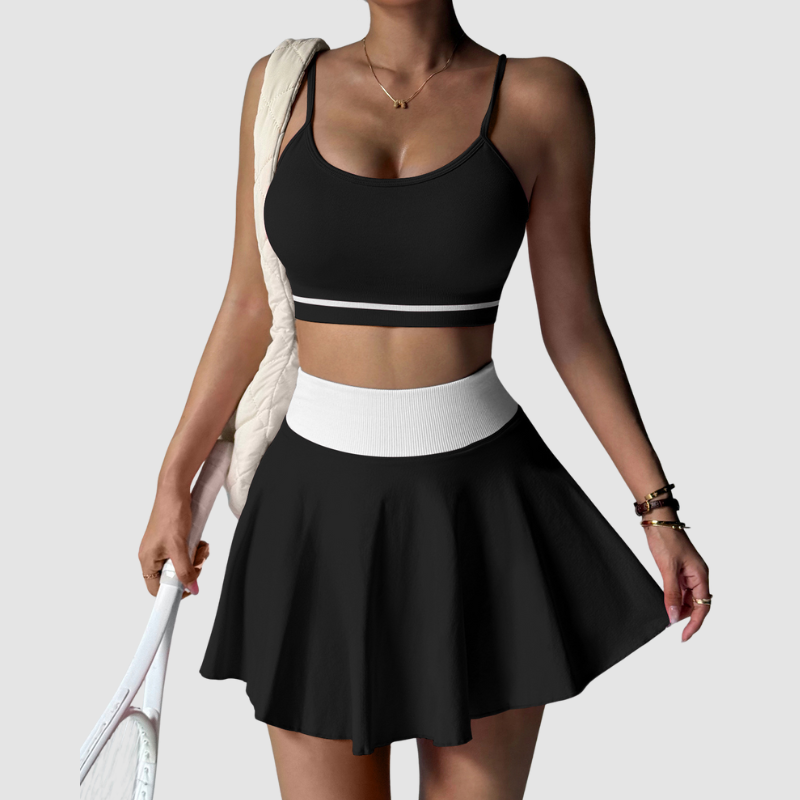 • Women's activewear set includes yoga sports bra and short high-waisted tennis skirt