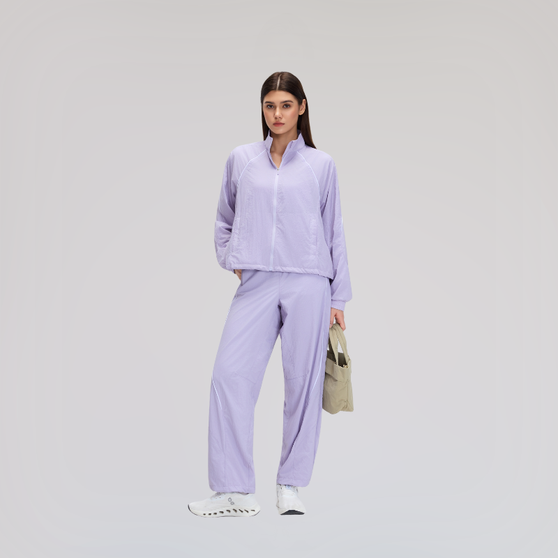 • Women's contrasting color casual sportswear set includes a short jacket and lightweight pants with an adjustable drawstring waist. Unique Design Points: • Straight from our production line to you. Enjoy factory-direct quality yoga wear. • Drawstring adjustable waistband + zippered slant pockets + drawstring cuffs • Windproof stand-up collar with zippered slant pockets