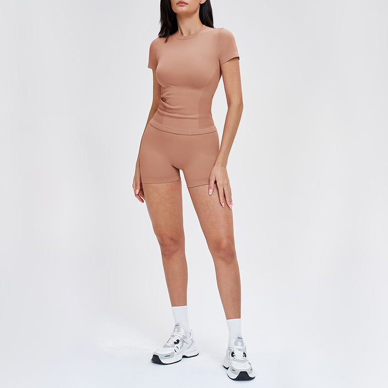 • This women's activewear yoga set includes a round-neck T-shirt and high-waisted, slim-fit shorts