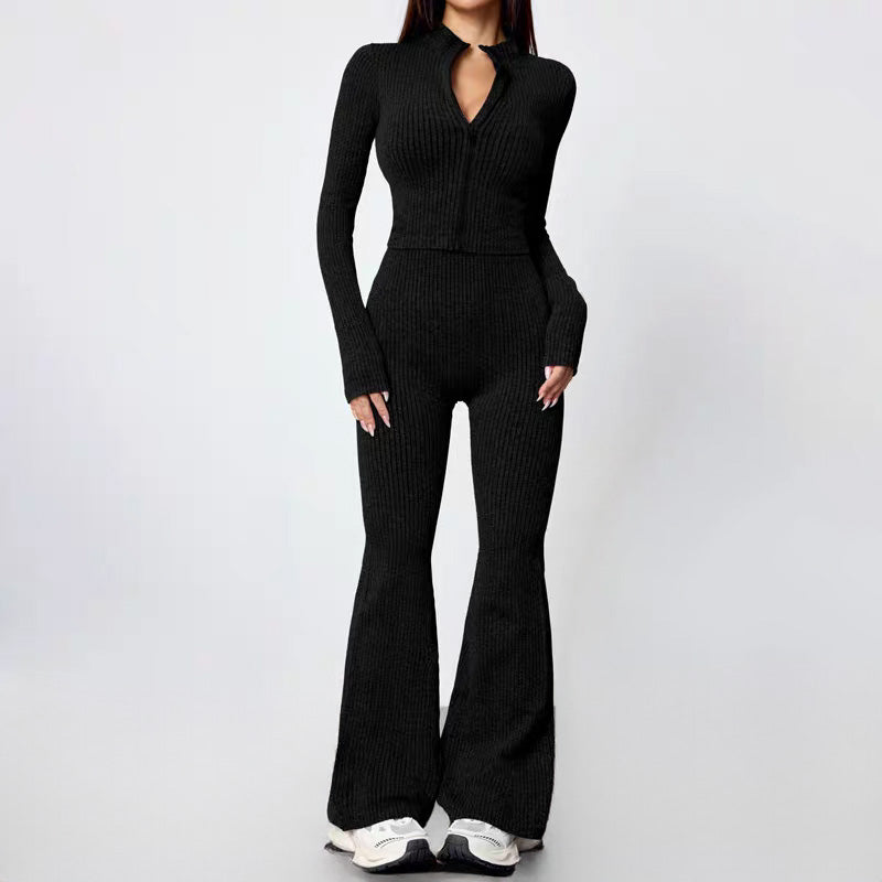 • Seamless knitted slim-fit long-sleeved jacket + body-hugging flared pants Unique Design Points: • Seamless knitted ribbed stretch design easily smooths the abdomen. • Zippered long-sleeved top provides a snug, shaping fit for easy wear and removal, allowing for unrestricted movement during exercise. • Upgraded hip-lifting design with a contoured waistline provides a supportive, sculpting effect, creating a perfect peach-shaped derriere.