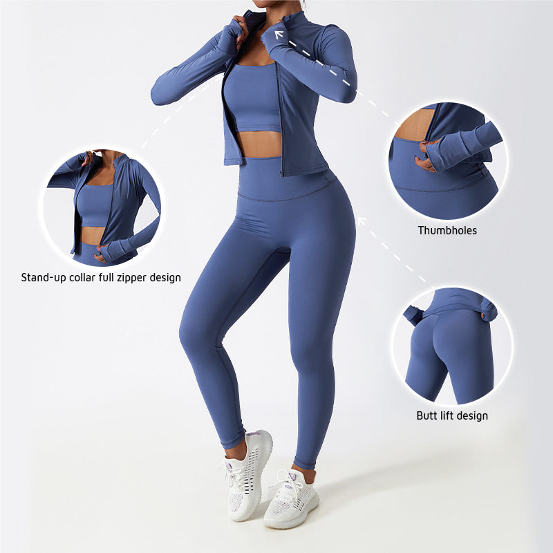 • Col debout complet Conception de fermeture éclair + trous de pouce pour maintenir les manches en place