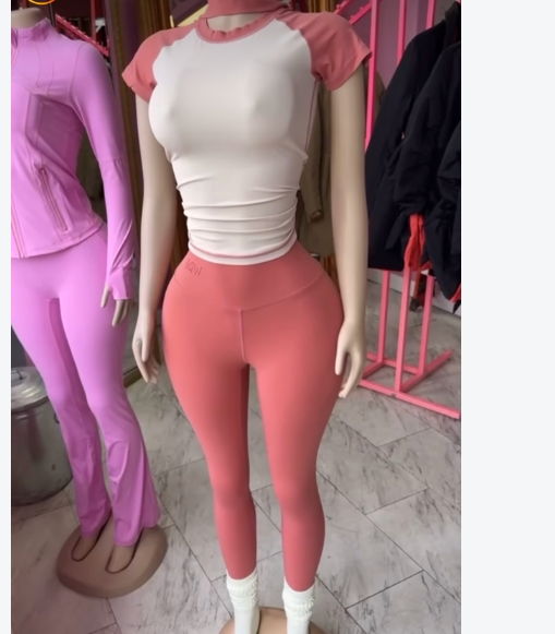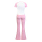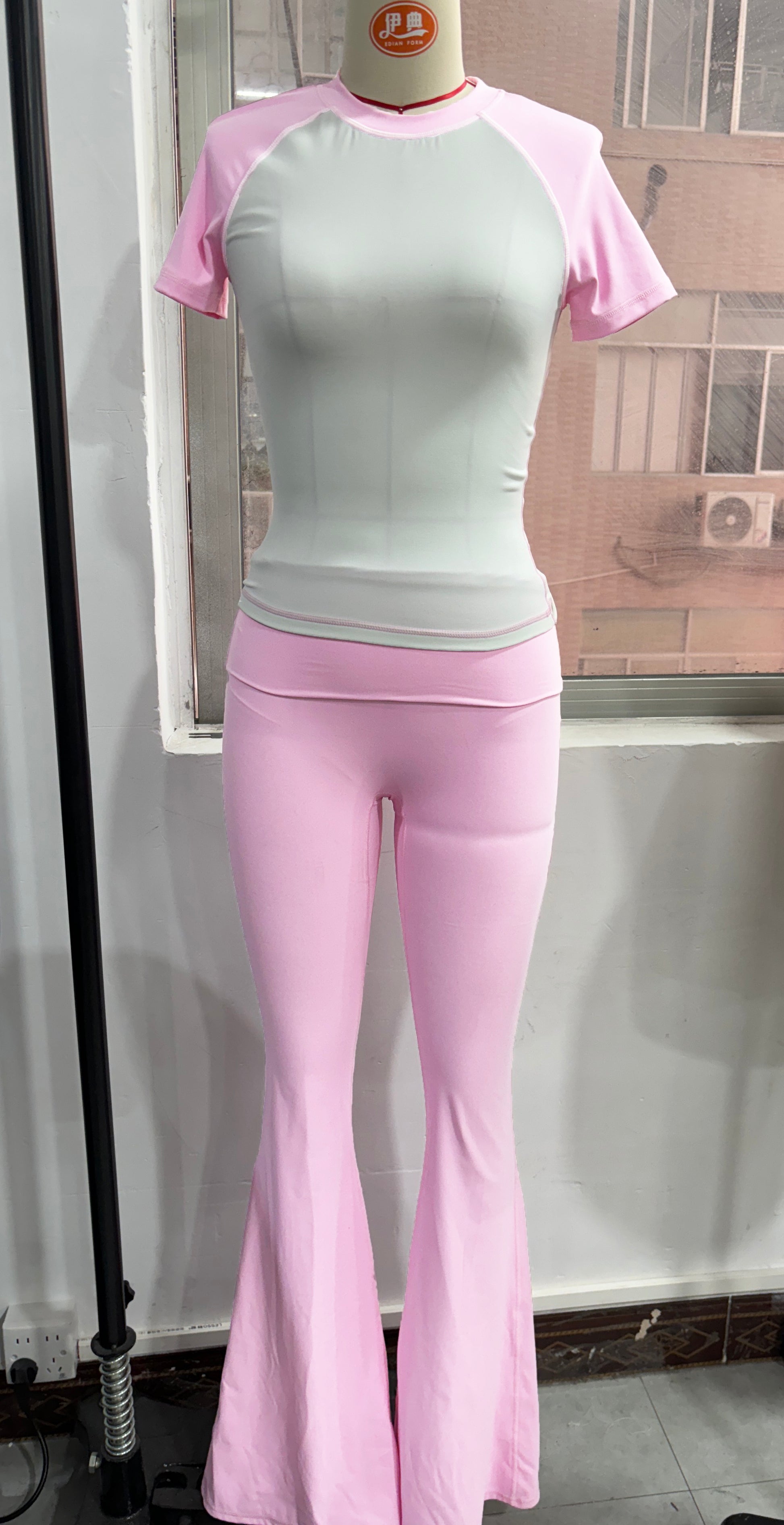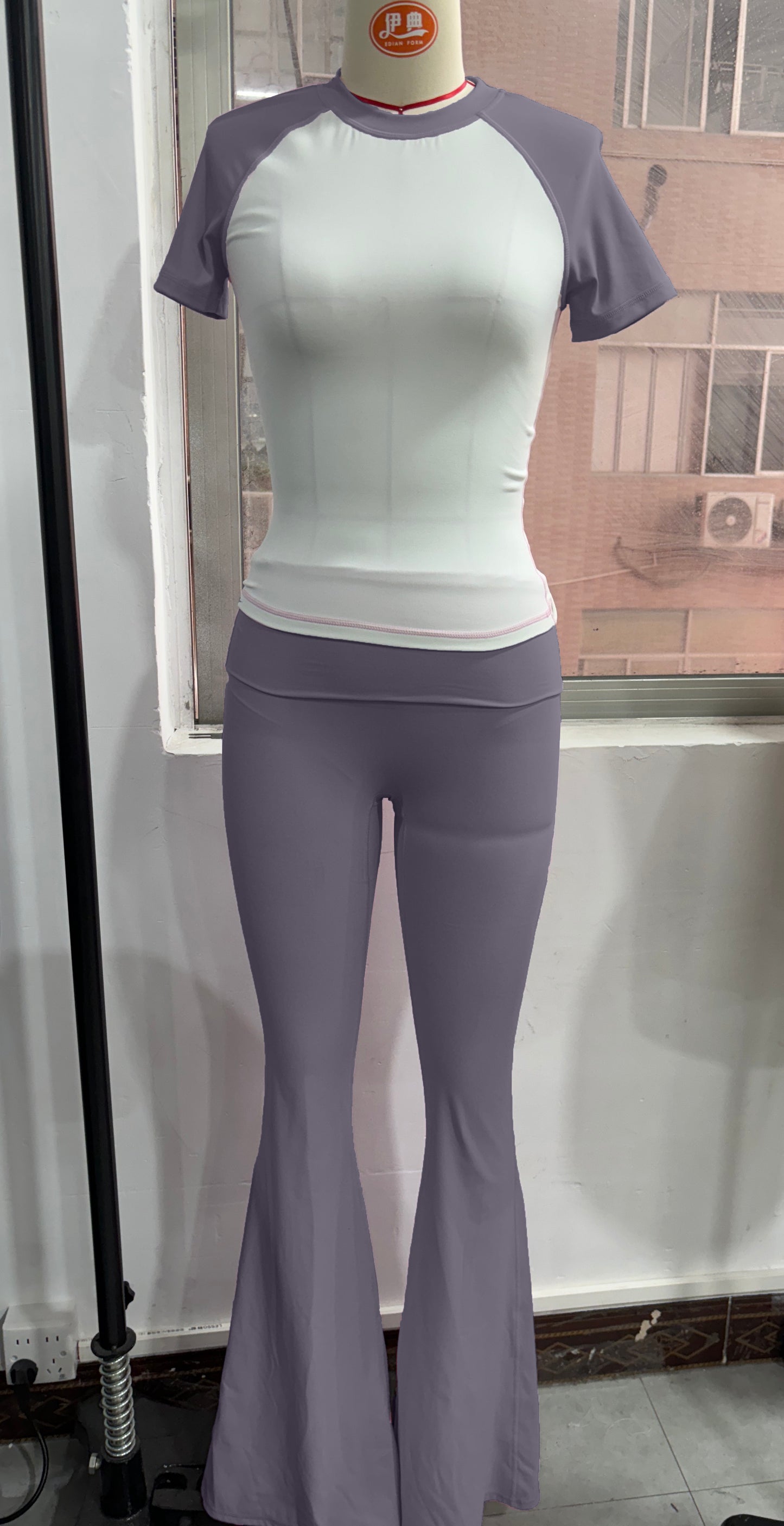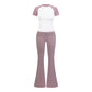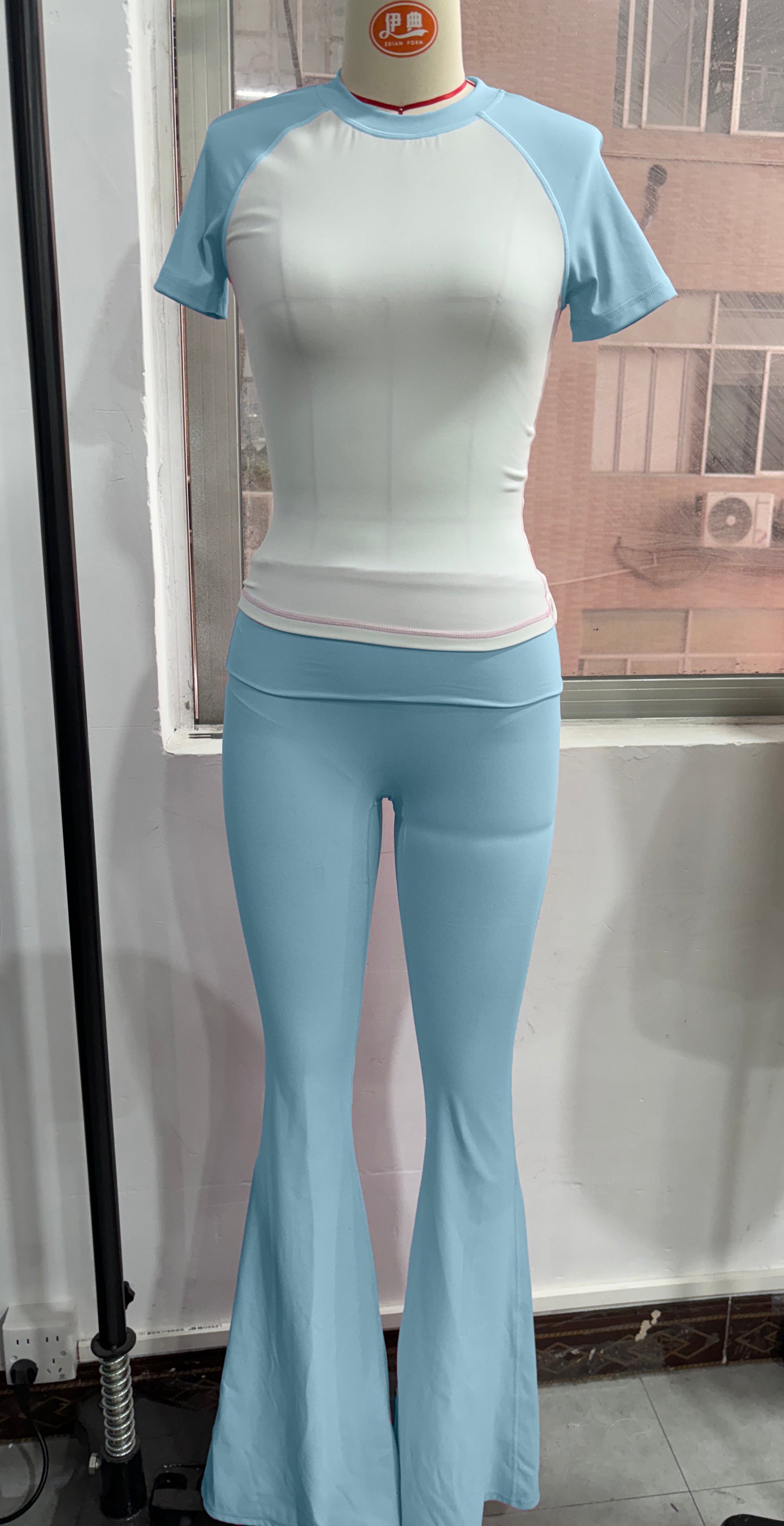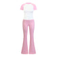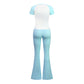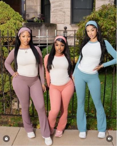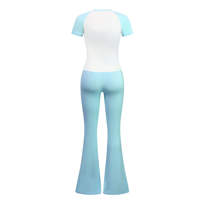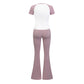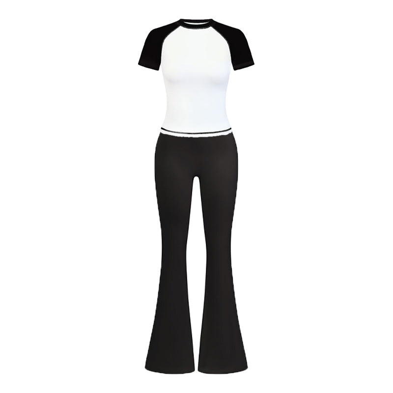 • Breathable contrasted color short sleeve sports top & high-waisted flared leg pant & same color headband 3-piece set design