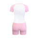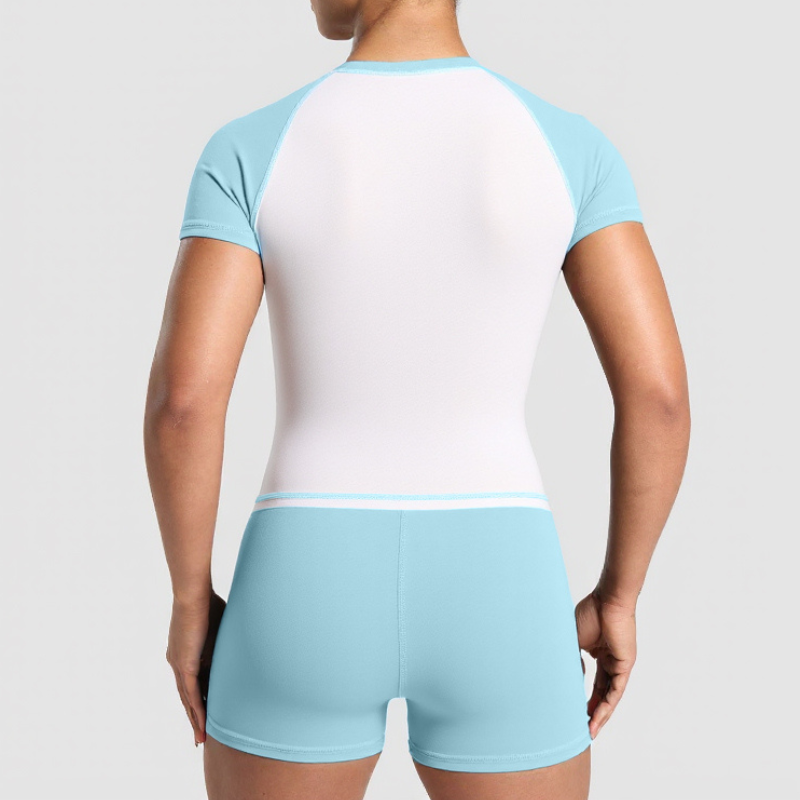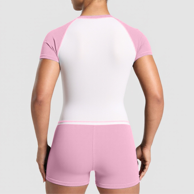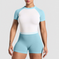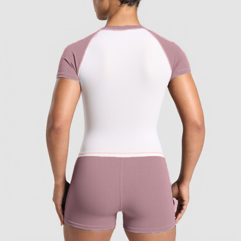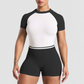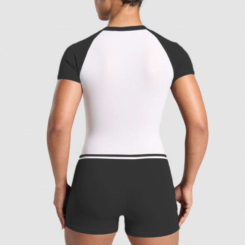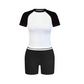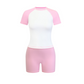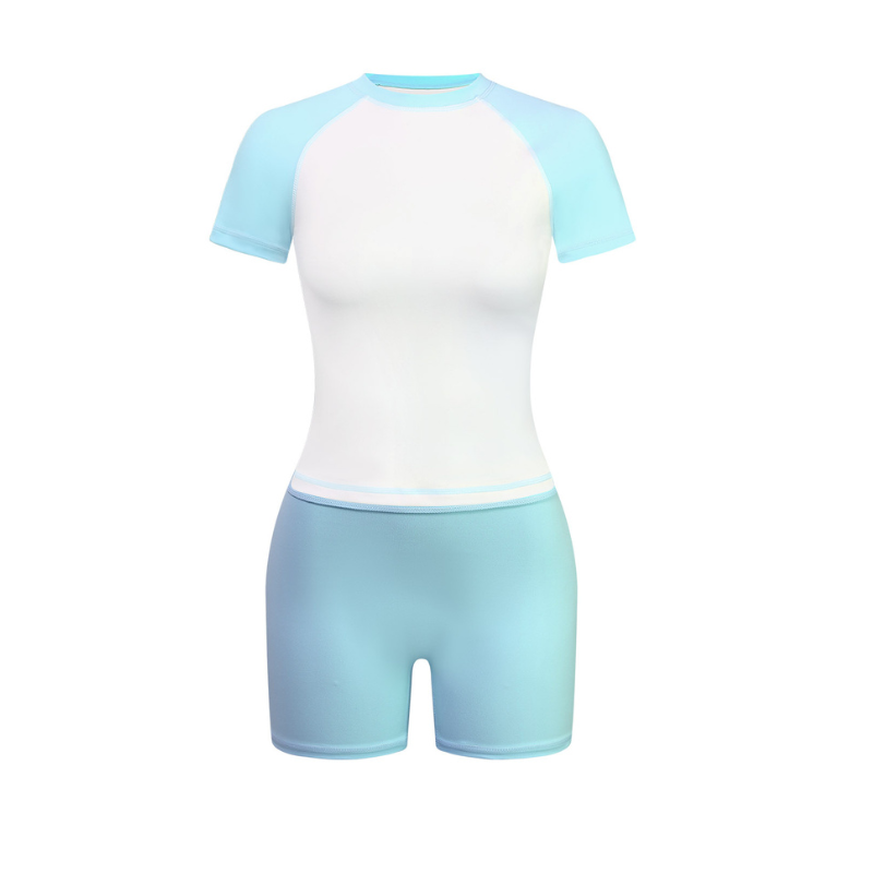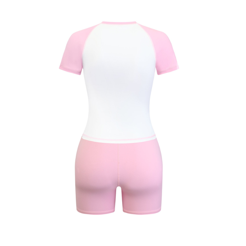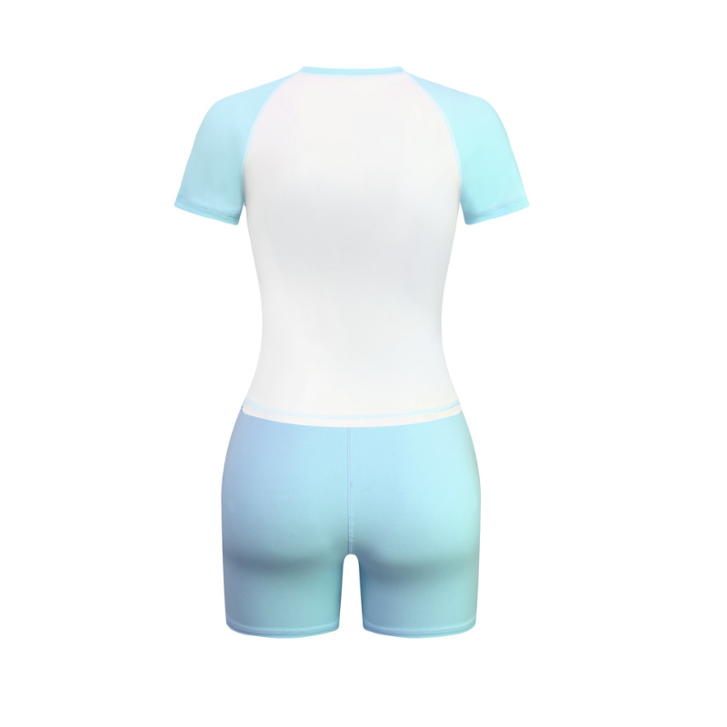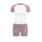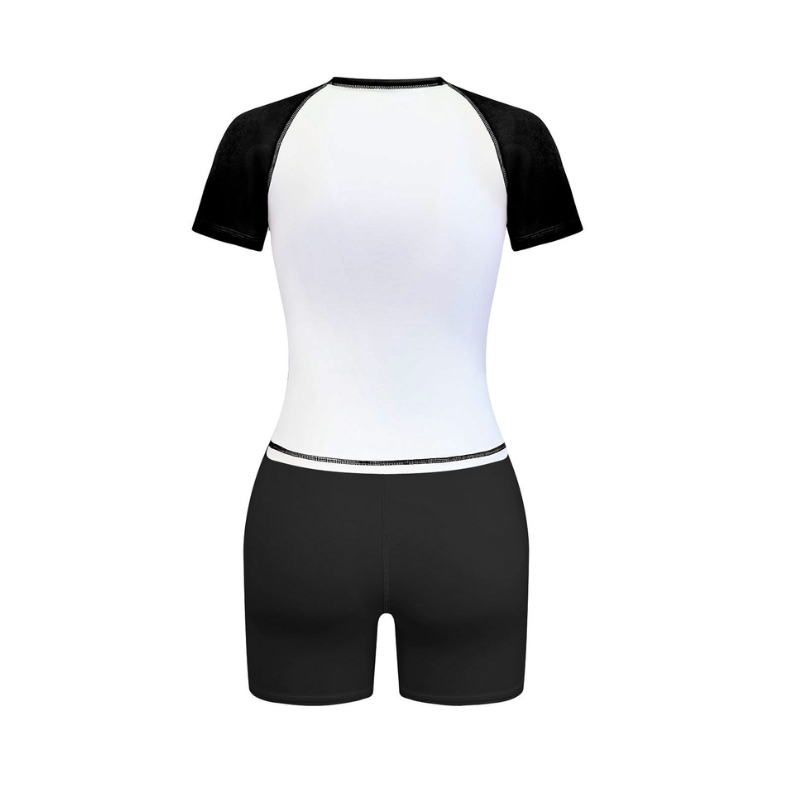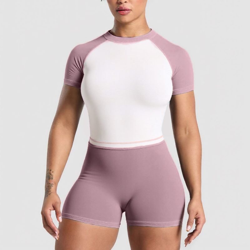 • Breathable contrasted color short sleeve sports top & high-waisted shorts & same color headband 3-piece set design