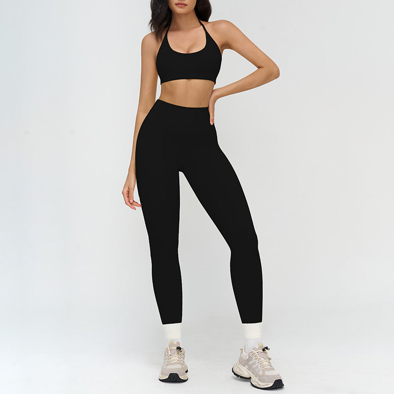 Halter-neck open-back sports bra + high-waisted leggings 2-piece set