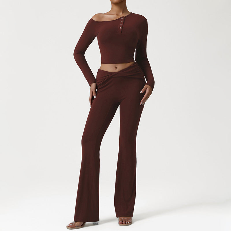 • Snug-fit one-shoulder cropped long sleeves & crossover waist flared pants set design