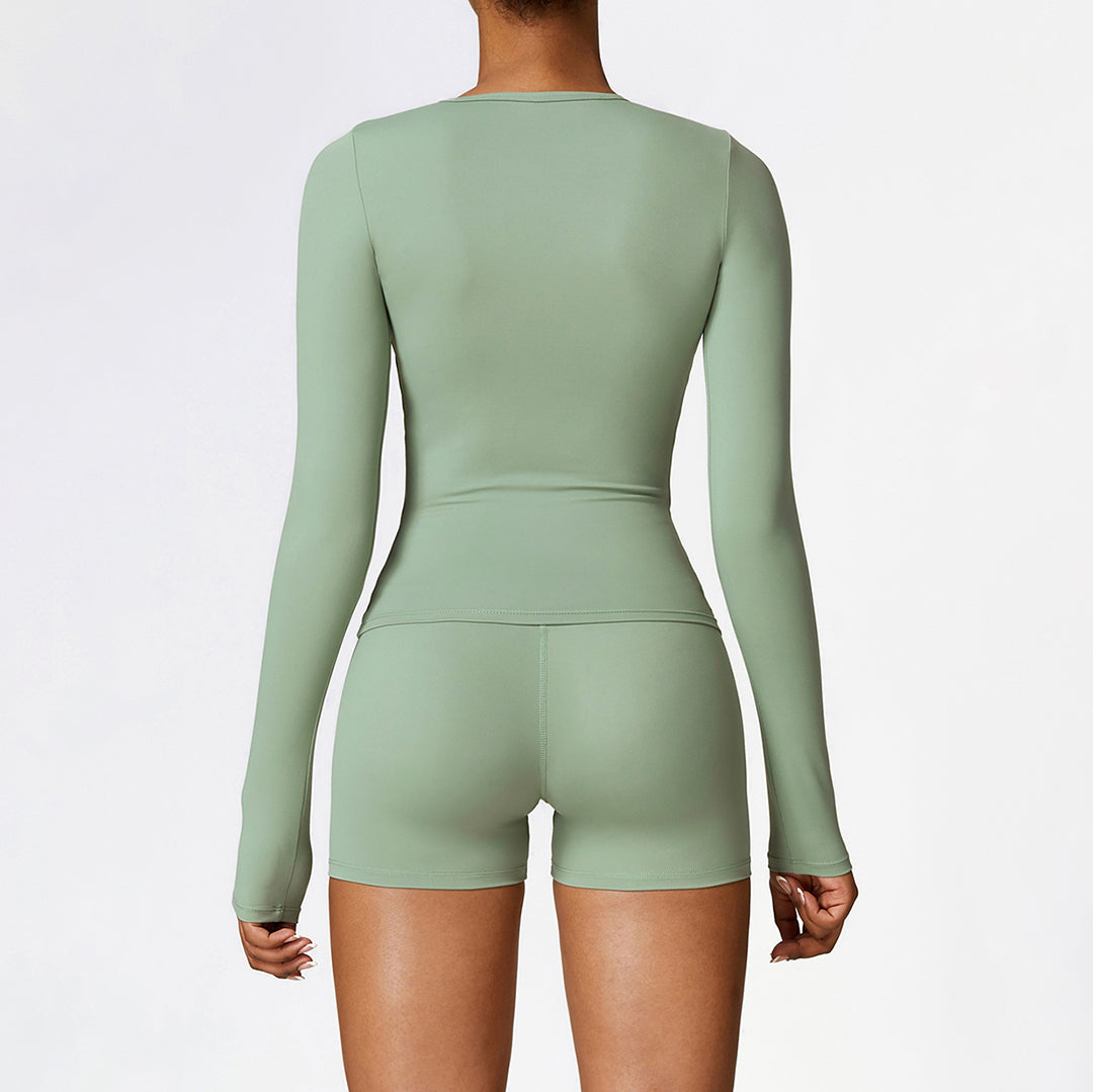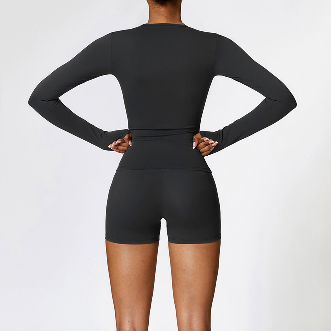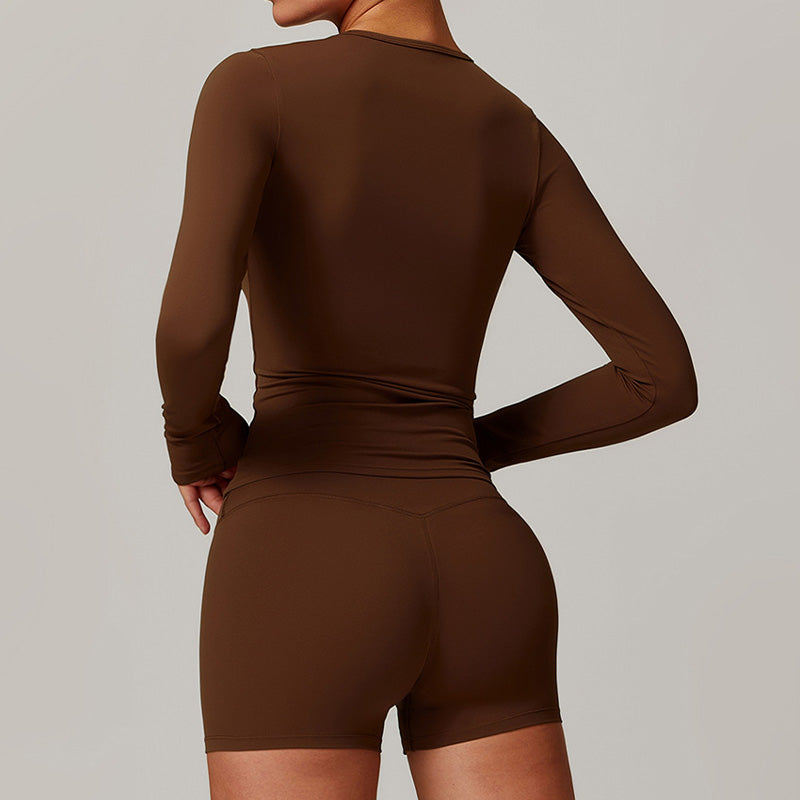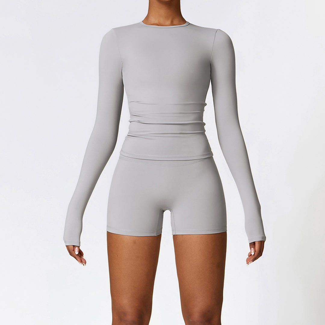 • Breathable brush long sleeve sports top and high-waisted shorts set design