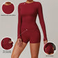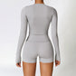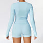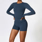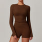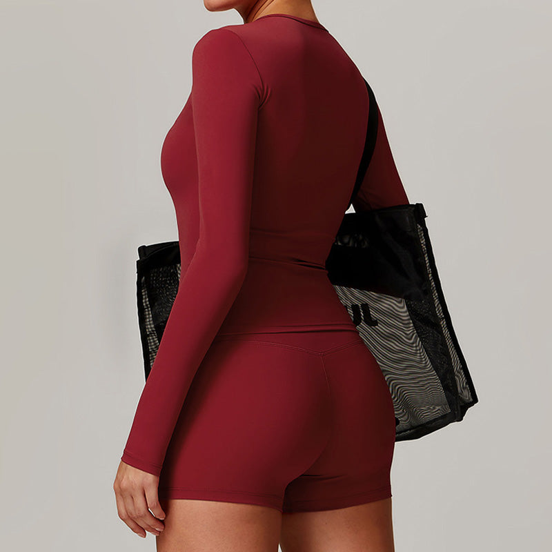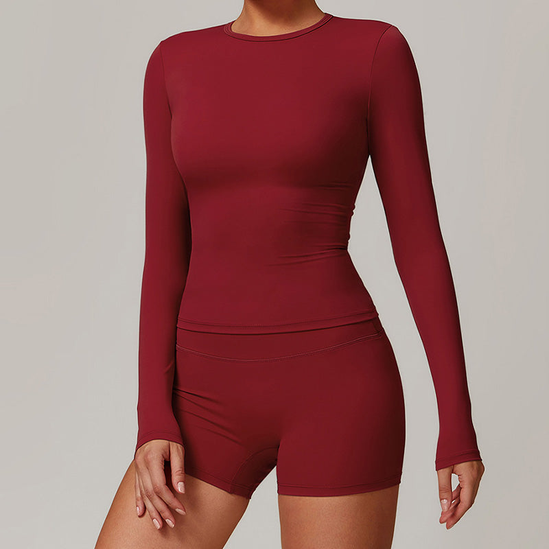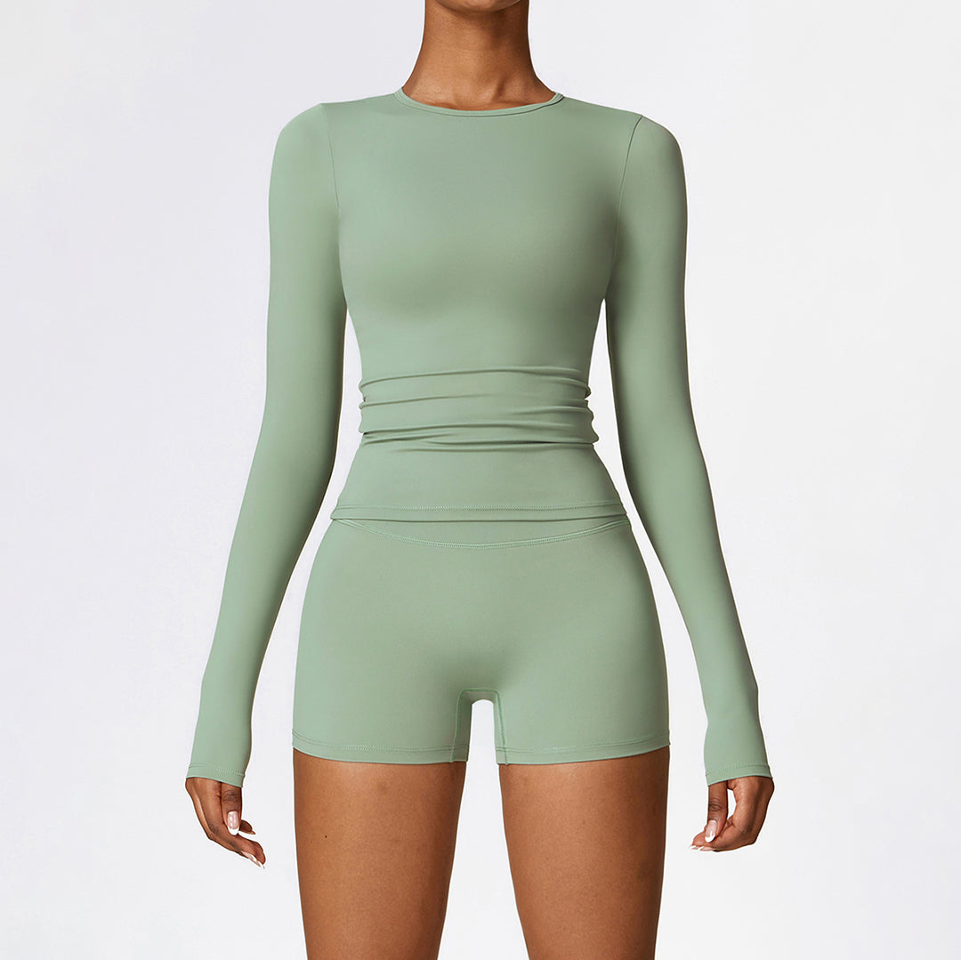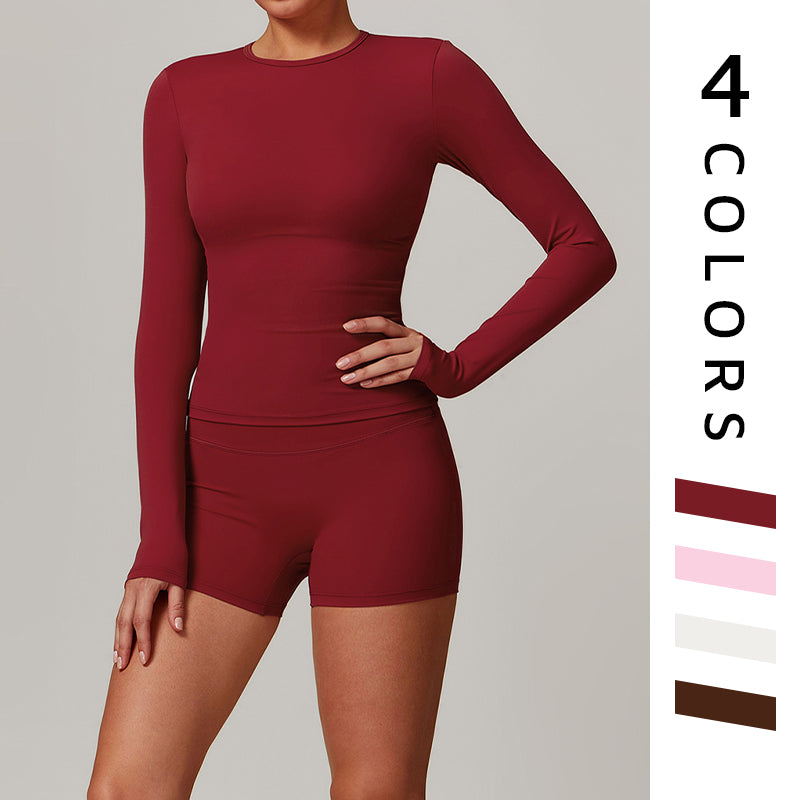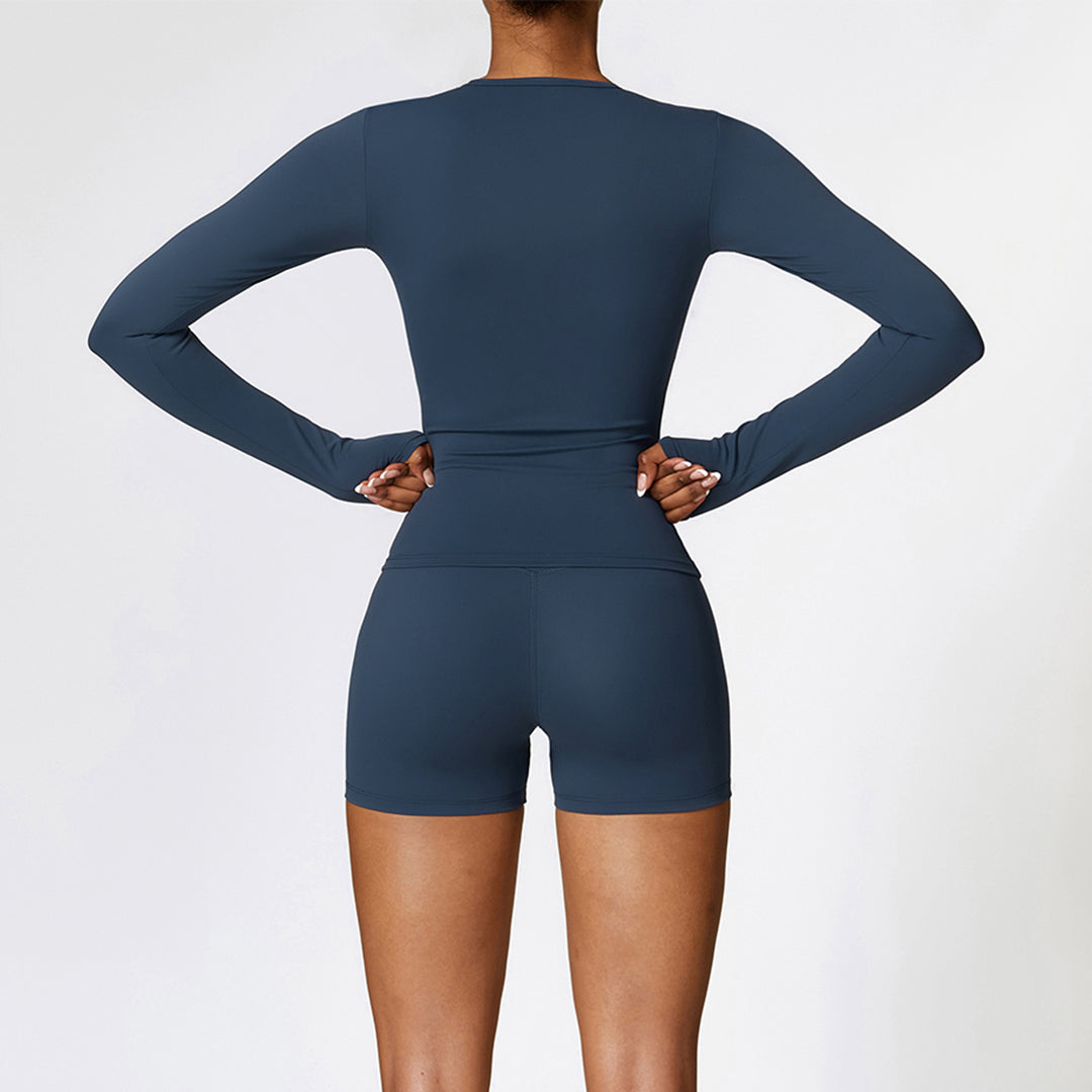 • Breathable brush long sleeve sports top and high-waisted shorts set design