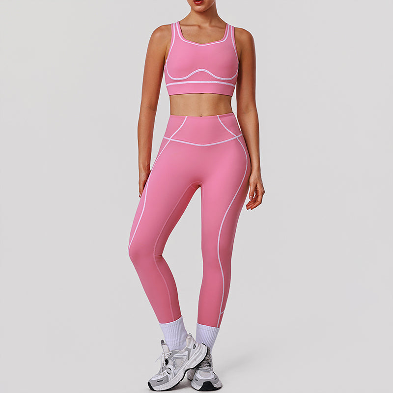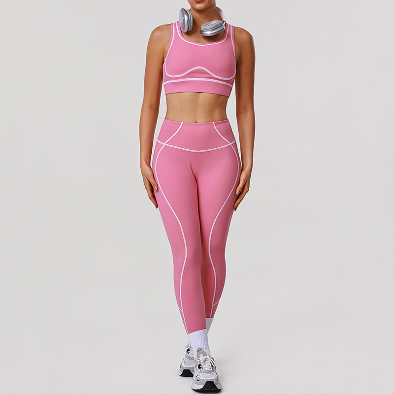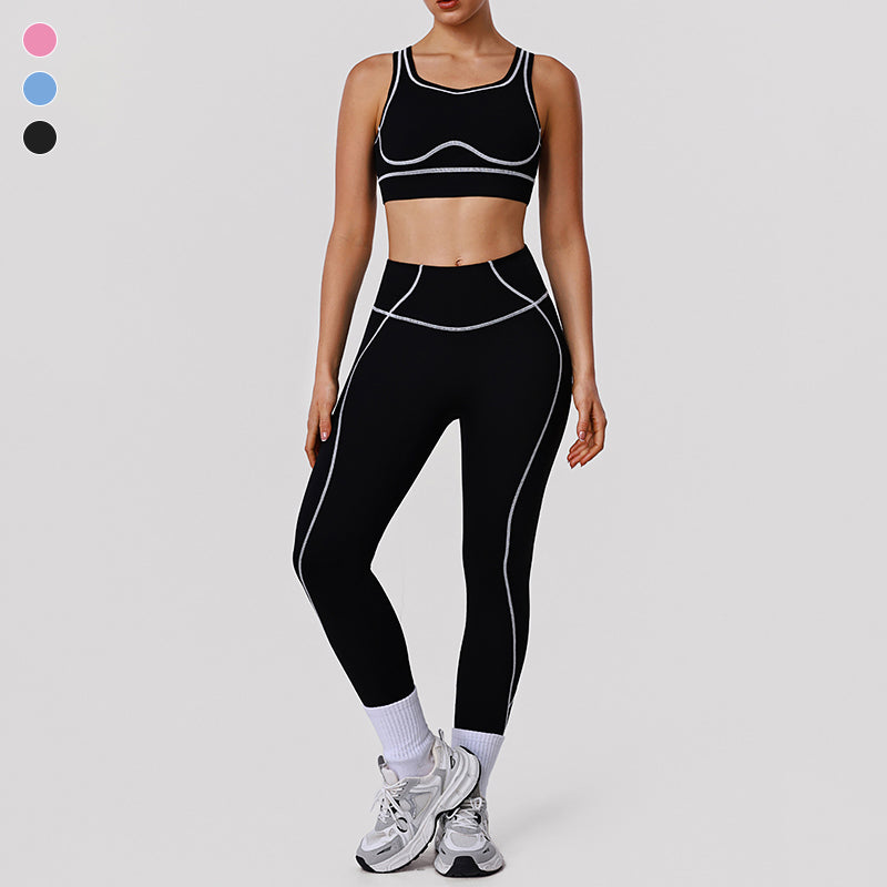 • Women's yoga and activewear set includes a contrasting color high-support sports bra and butt-lifting leggings. Unique Design Points: • Straight from our production line to you. Enjoy factory-direct quality yoga wear. • Openwork back design creates a visually slimming effect. • Shaping lines provide gentle support and lift for the bust. • Contrasting shaping lines visually lengthen the legs.