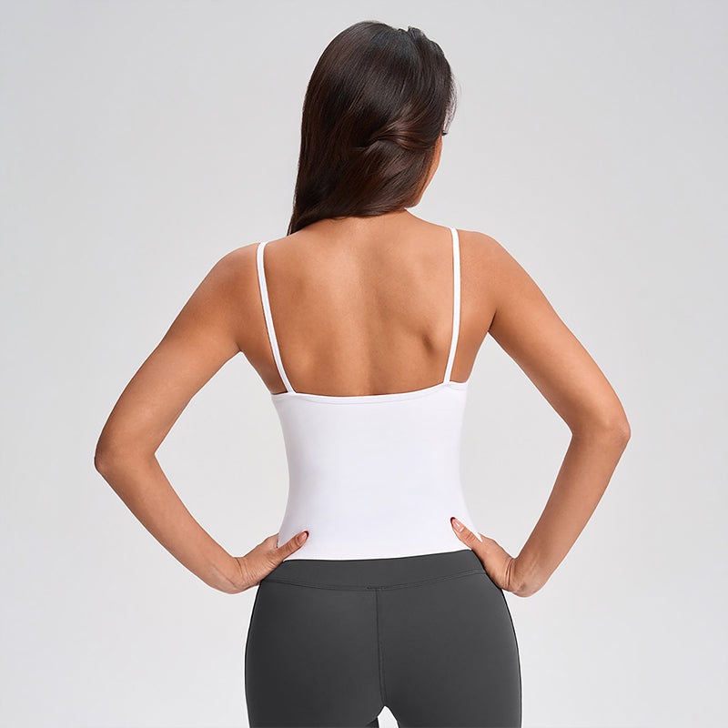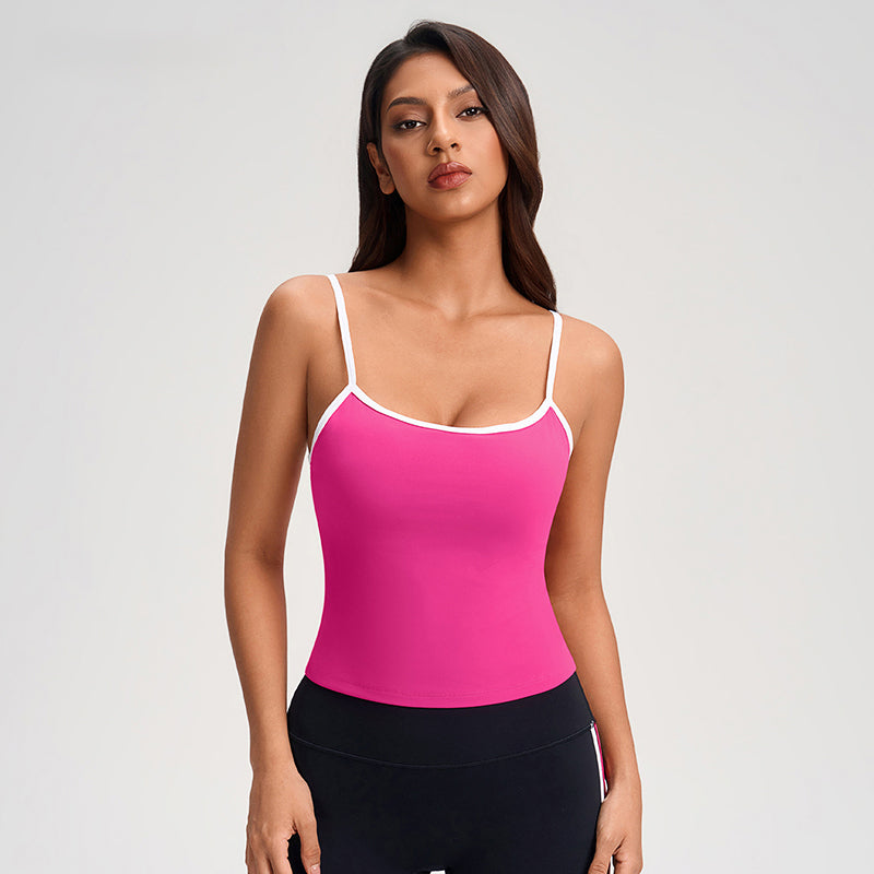 • Women's contrasting color strappy open-back tank top with Removable Pads Unique Design Points: • Straight from our production line to you. Enjoy factory-direct quality yoga wear. • Contrasting color, thin-strap, open-back design • Removable bra pads + U-shaped neckline