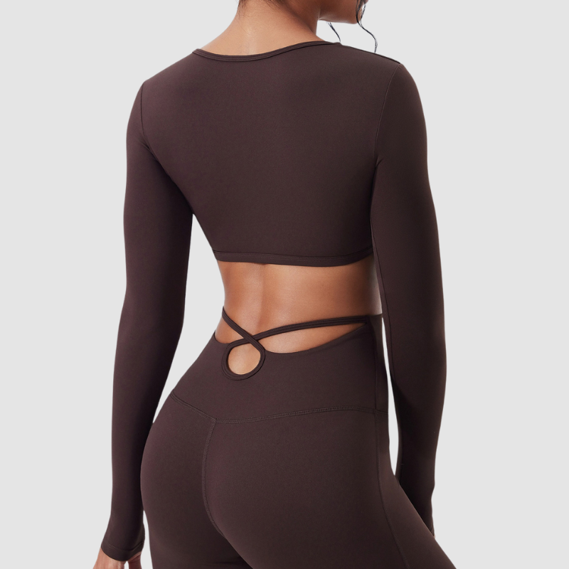 • This women's athletic set includes a long-sleeved, openwork top and high-waisted flared pants.