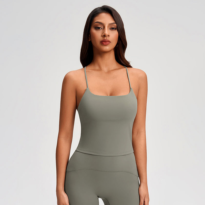 • Women's thin-strap open-back sports tank top with elastic hem