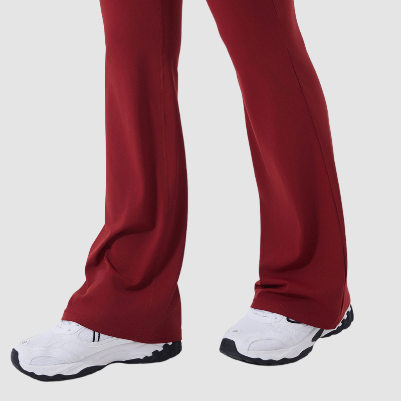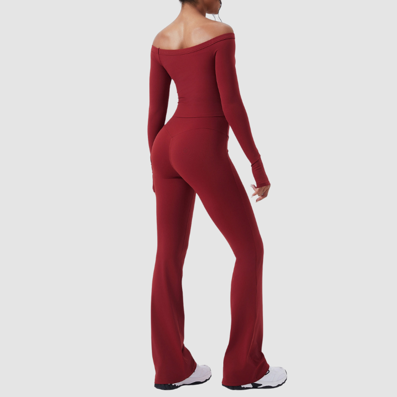 • Women's activewear set includes off-the-shoulder long-sleeved top and high-waisted flared pants Unique Design Points: • Straight from our production line to you. Enjoy factory-direct quality yoga wear.