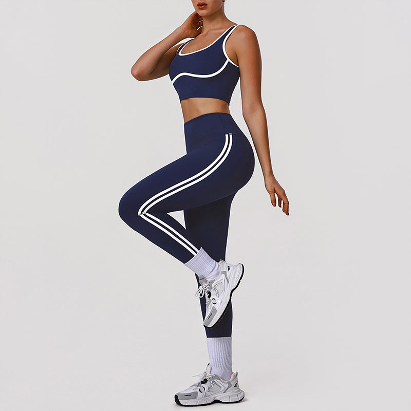 • Women's yoga and sportswear set includes a U-back bra with removable pads and contrasting color side-striped leggings. Unique Design Points: • Straight from our production line to you. Enjoy factory-direct quality yoga wear. • Contrasting color lines at the front and center enhance the bust shape. • Removable bra pads for easy replacement. • Contrasting color lines on the sides add a sporty feel.