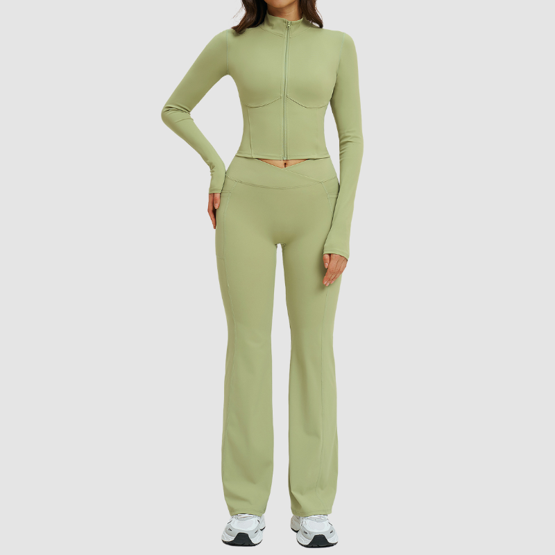 • Women's activewear set includes a stand-collar slim-fit jacket and high-waisted flared pants