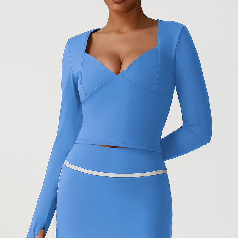 • Women's solid color long-sleeved top with V-neck, fitted waist, and high-waist design. Unique Design Points: • Straight from our production line to you. Enjoy factory-direct quality yoga wear. • Three-dimensional tailoring at the chest provides support and enhances the bust shape. • Large U-shaped V-neck design showcases athletic aesthetics. • Features integrated finger loops for added functionality during exercise.