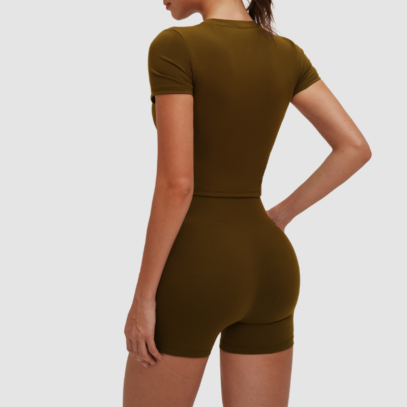 • Women's activewear set includes a round neck solid color slimming short-sleeved top and high-waisted shorts